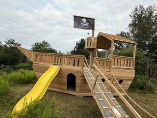 The “Big” Pirate Ship is a very popular size and is the perfect play structure in any backyard or play area. It features over 200 sq ft of deck play space and measures an awesome 17 ft long by 8 ft wide! The total play space needed for a “Big” ship is approx. 30’ wide x 25’ deep.